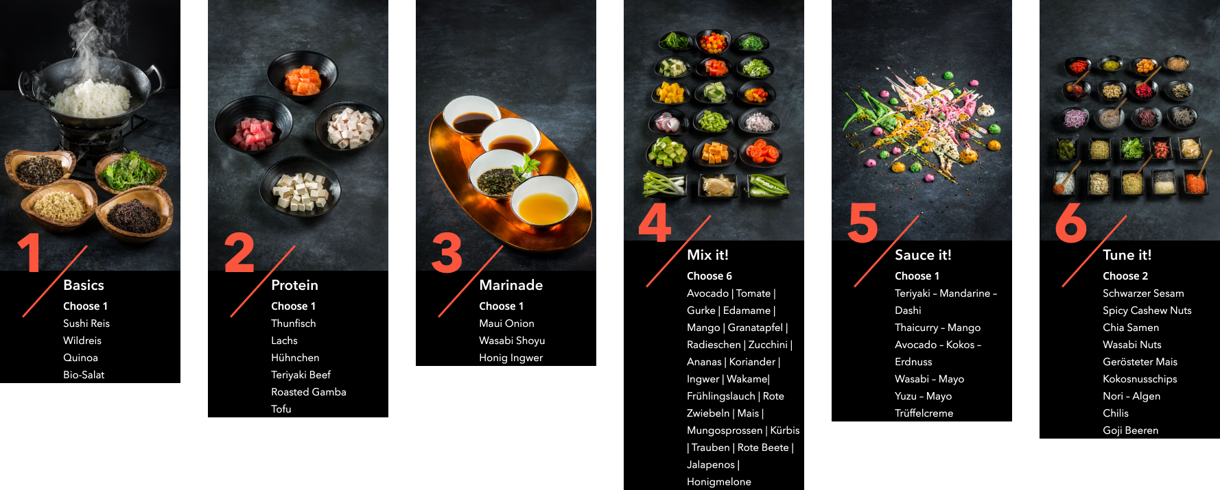 Here is a way to use a restaurant menu to explain design tokens. This particular restaurant offers bowls and customers are able to pick their own ingredients, but are guided through the process. The process has to be quick for the restaurant to process many customers for business profitability and understandable for customers to be able to perform their order. The menu guides through this process by picking a starter first, protein second, marinade as third and more steps to add ingredients to complete a custom order.