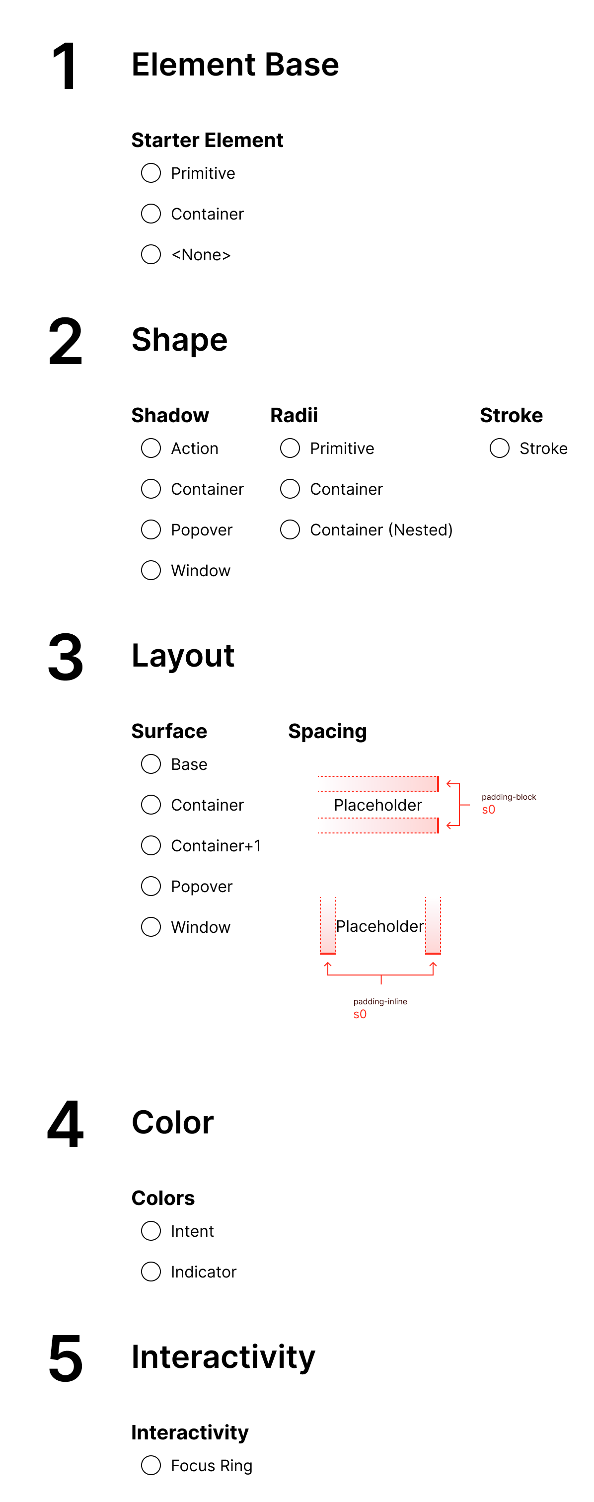 Likewise, the same idea can be used for design tokens when developing a new component. Begin with a starter element that has some properties pre-configured (or start from scratch) and then add more and more tokens for your component until finished.
