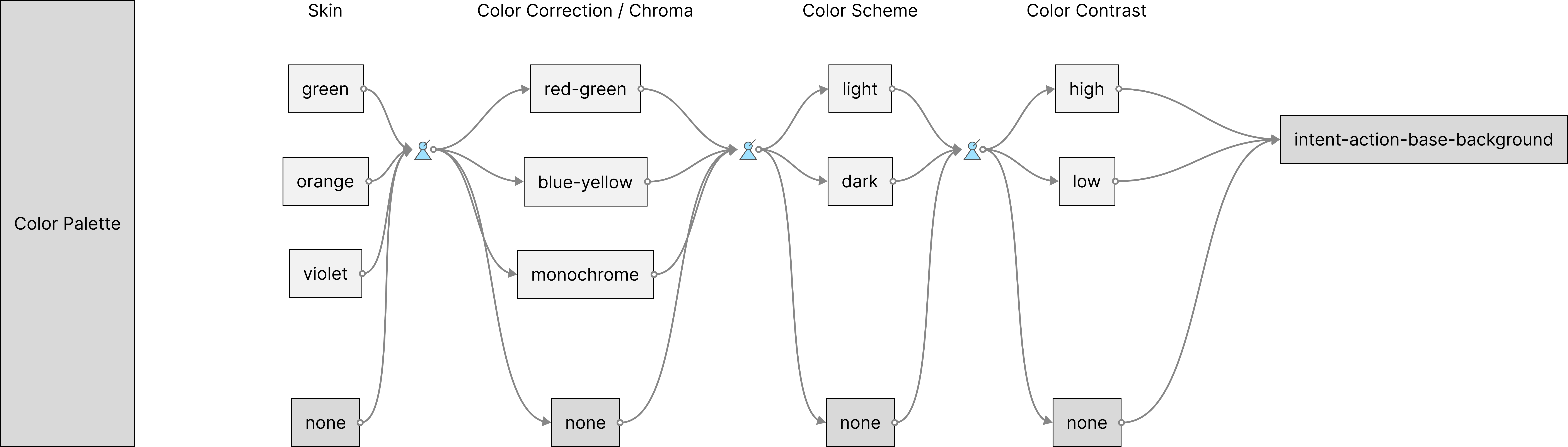 Not every feature requires creating a switch for a token, which is visualized through the None path. These switches make sense for color type tokens. Typography, sizing, animation and other types each follow their own rules.
